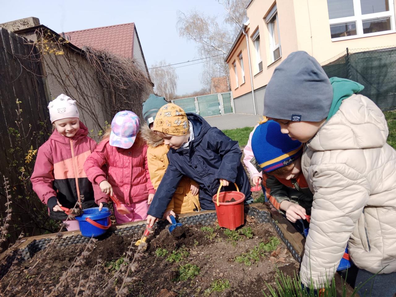 První jarní den se třída Motýlků vydala na školní zahradu,aby mohla jaro řádně přivítat. Společně jsme osázeli truhlíky maceškami a ozdobili je barevnými stužkami a zapichy. Také jsme vypleli záhon a zaseli hrášek s cibulí.Společná práce na zahradě nás moc bavila a už teď se nemůžeme dočkat bohaté úrody.
