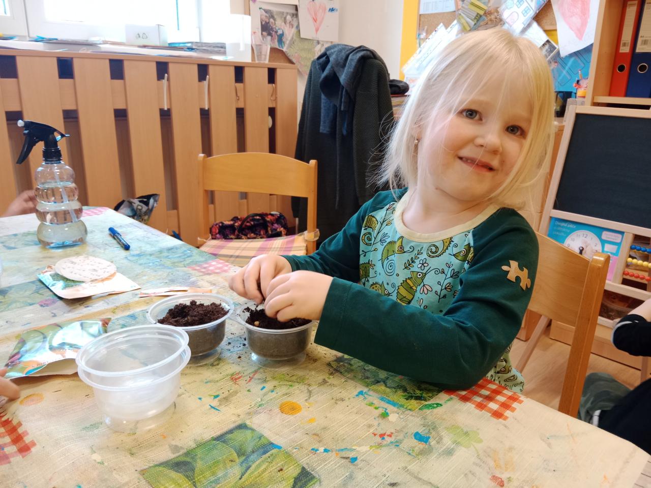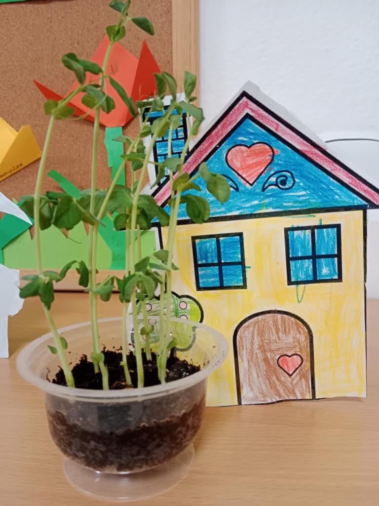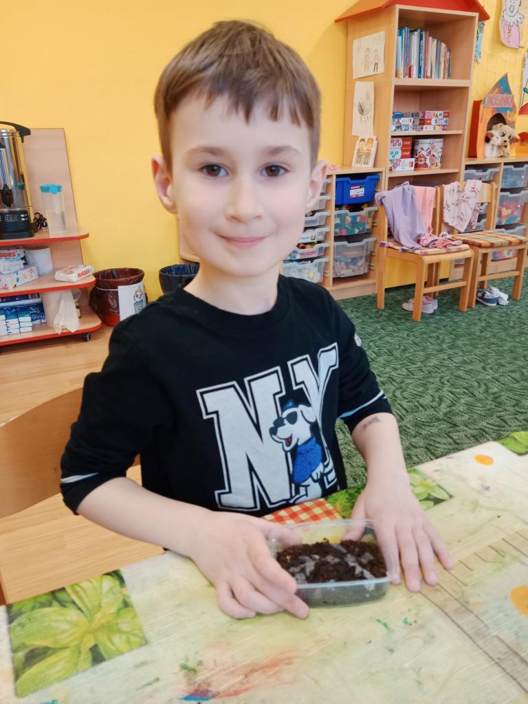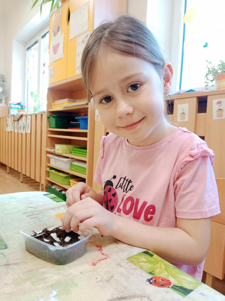 Společně jsme si připravili kelímky, hlínu a semínka hrachu a řeřichy. Děti si vyzkoušely, jak se semínka sází, jak se o ně pečuje a co všechno potřebují pro svůj růst - slunce, vodu, péči. Každé dítě si osázelo svůj vlastní kelímek, o který se staral. Každý den jsme společně sledovali, co se mění a jak ze semínka postupně vyrůstá rostlinka. Děti se tak učily trpělivosti, odpovědnosti a získaly bližší vztah k přírodě.
