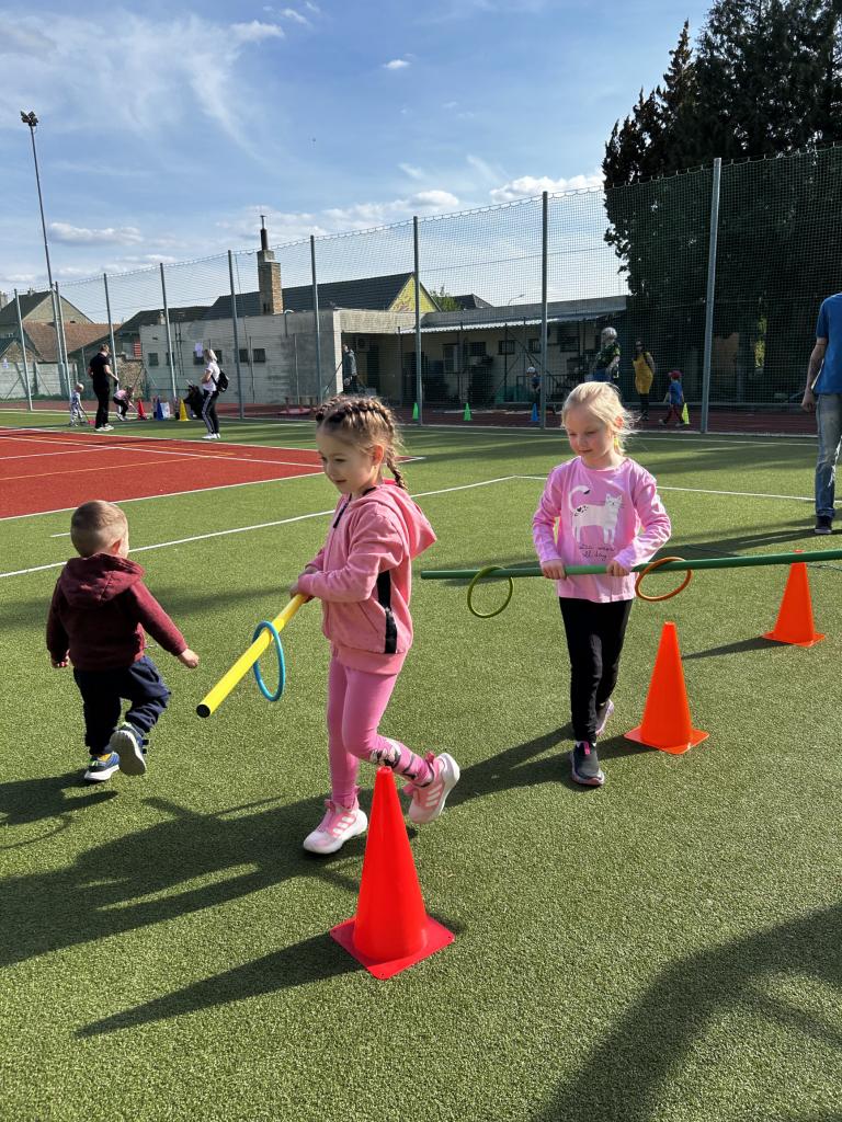 Na hřišti děti čekala řada zábavných sportovních úkolů. Jako motýlci poletovali slalomem mezi kužely po boku motýla Emanuela, se slepičkou Růženkou opatrně přenášely vajíčka na lžičce, snažily se trefit kroužky na zobák čápovi Pepíkovi a hokejkou mířily balonkem do tlamičky zajíčka Felixe.