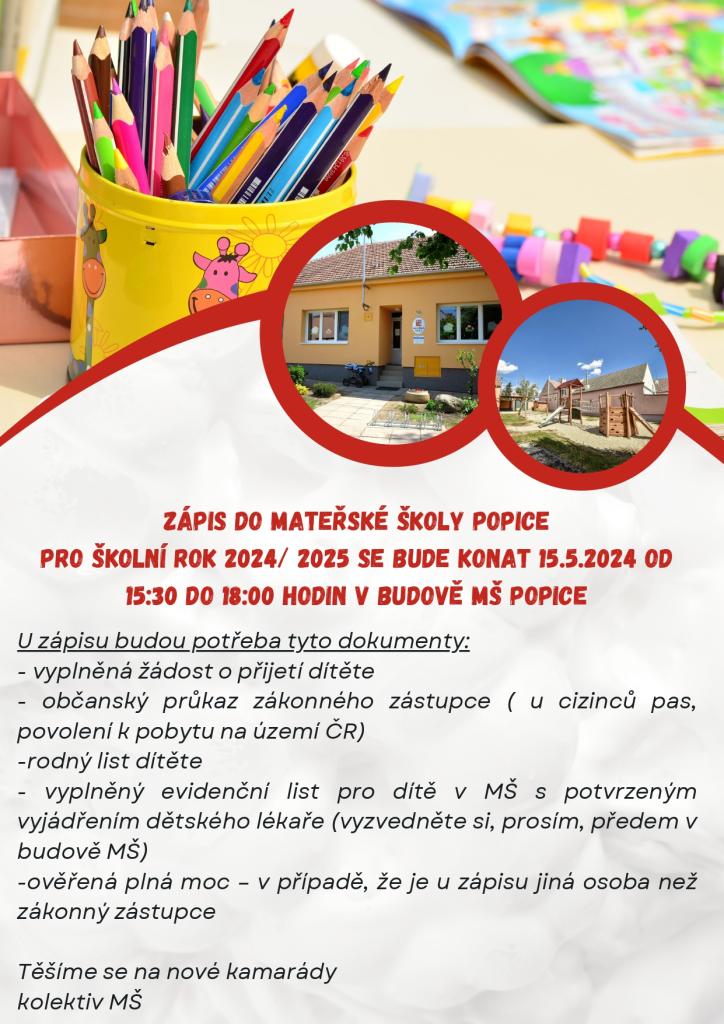 Zápis do mateřské školy Popice pro školní rok 2024/2025 se bude konat 15. května 2024 od 15:30 do 18:00 hodin v budově MŠ Popice. Internetový odkaz pro elektronické přihlášení bude spuštěn 1. května 2024. Informace naleznete zde.