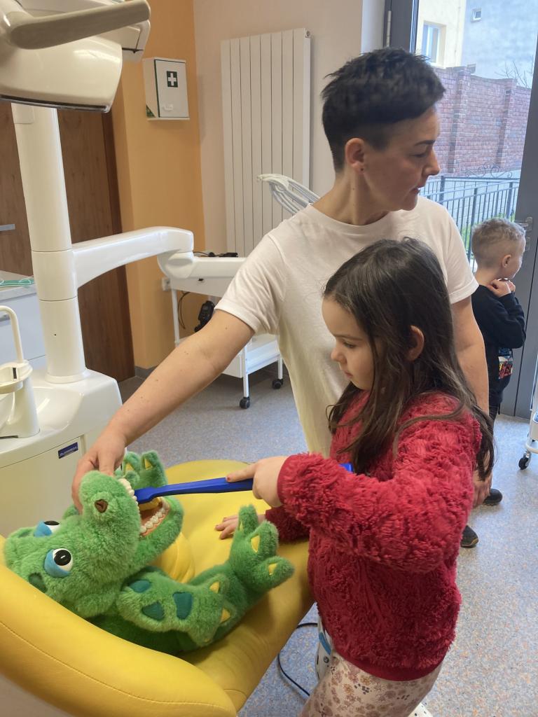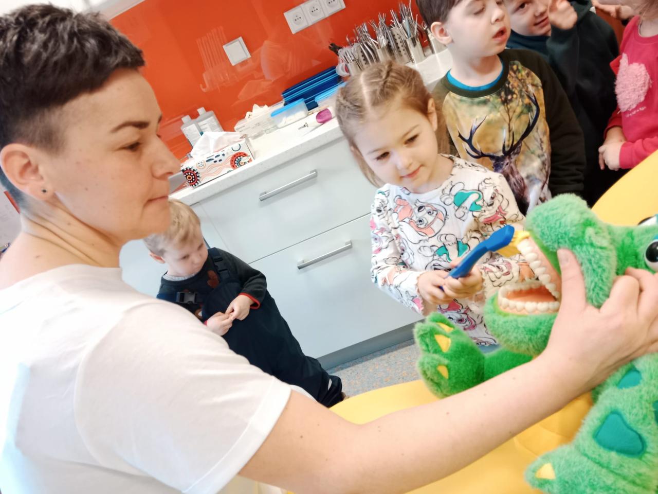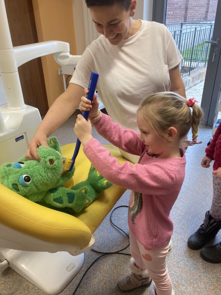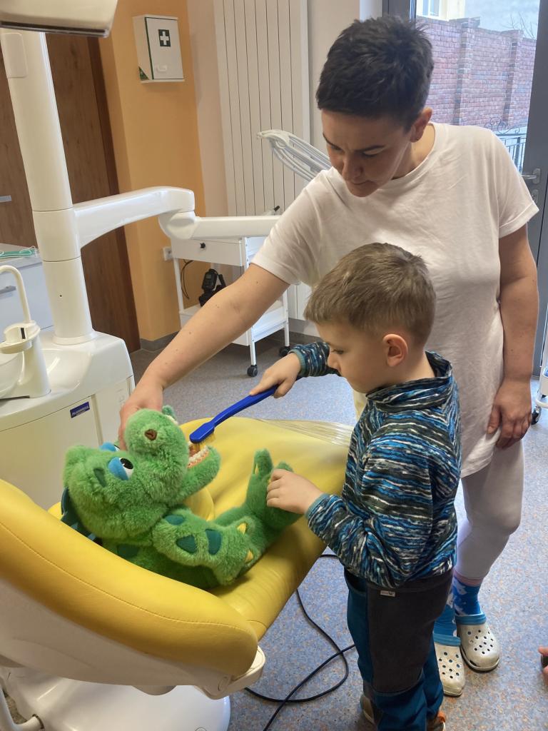 Paní hygienistka jim ukázala, jak si správně čistit zoubky, jaký kartáček a pastu si vybírat a proč je důležité pravidelně chodit na kontrolu. Děti si vyzkoušely čištění zubů na velkém modelu a plnily zábavné úkoly. Za svou snahu dostaly odměnu.