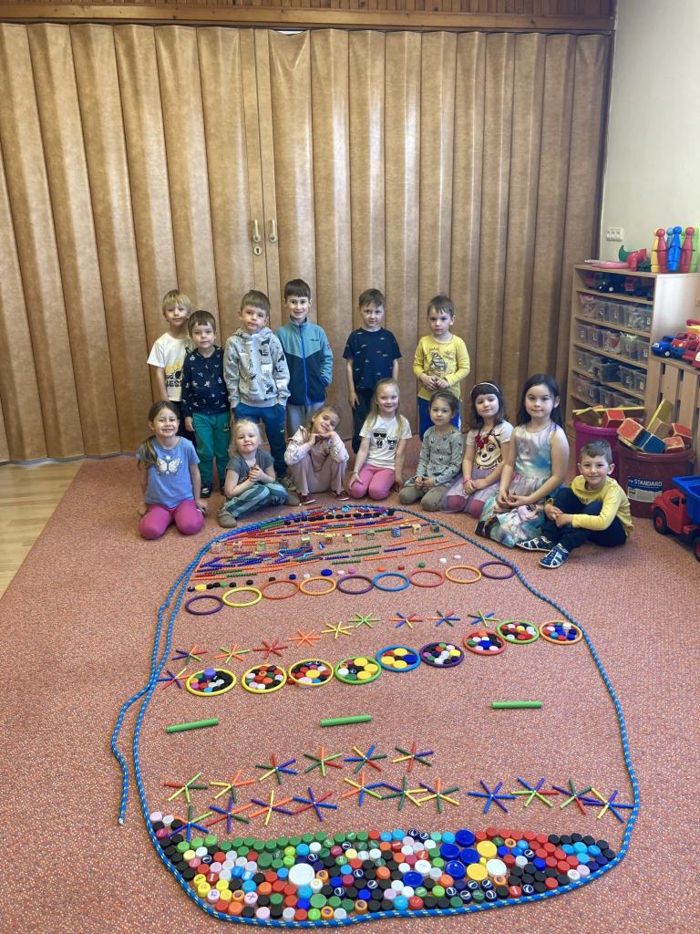 Ve třídě motýlků si děti zkusili poskládat veliké velikonoční vajíčko. Vytvořili ozdoby z kostek a různých skládaček. Naučili se tak spolupracovat a domlouvat se mezi sebou.