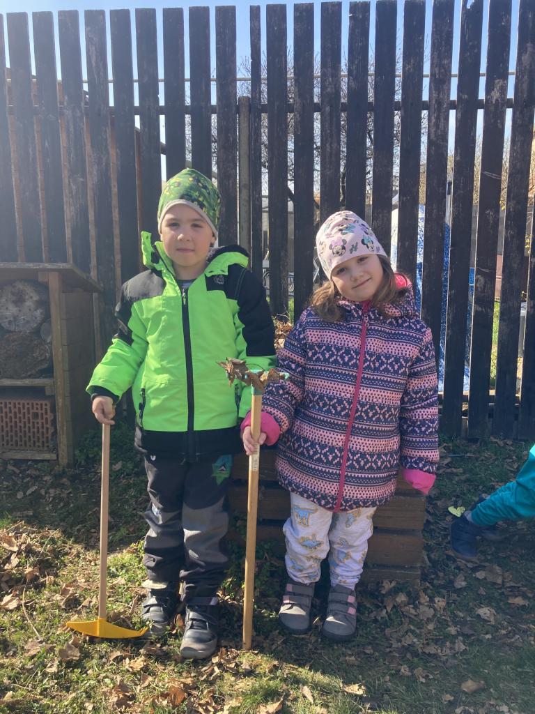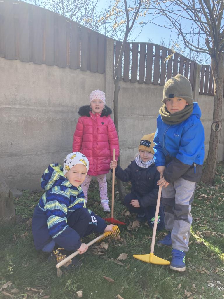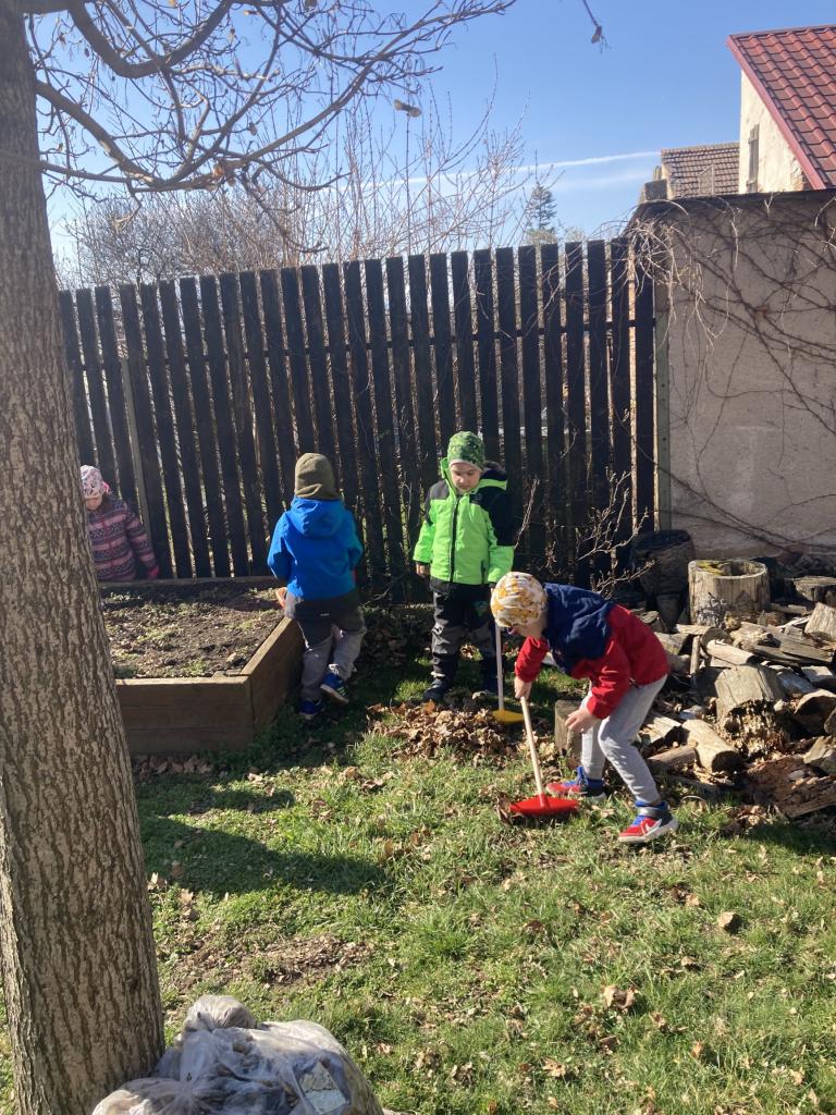 Děti se hned vrhly do práce. Vytrhaly jsme trávu, prohrabaly hlínu, očistily od všech nečistot a zbytku listí z podzimu. Dětem se úklid zahrady líbil natolik, že se pustily i do hrabání spadaného listí. Vše jsme uložili do kompostérů a teď už se můžeme jen těšit co dobrého si do záhonku zasazíme a vypěstujeme.