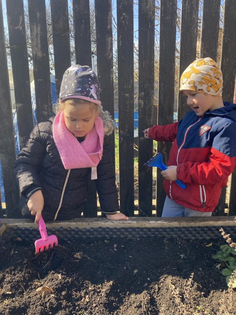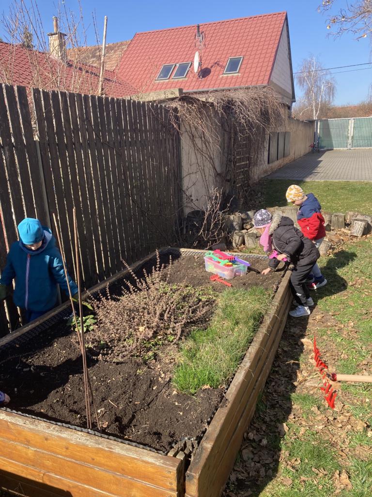 První jarní den jsme se s motýlky vydaly na školní zahradu, připravit záhonek na pěstování zeleniny a ovoce.