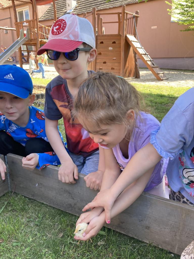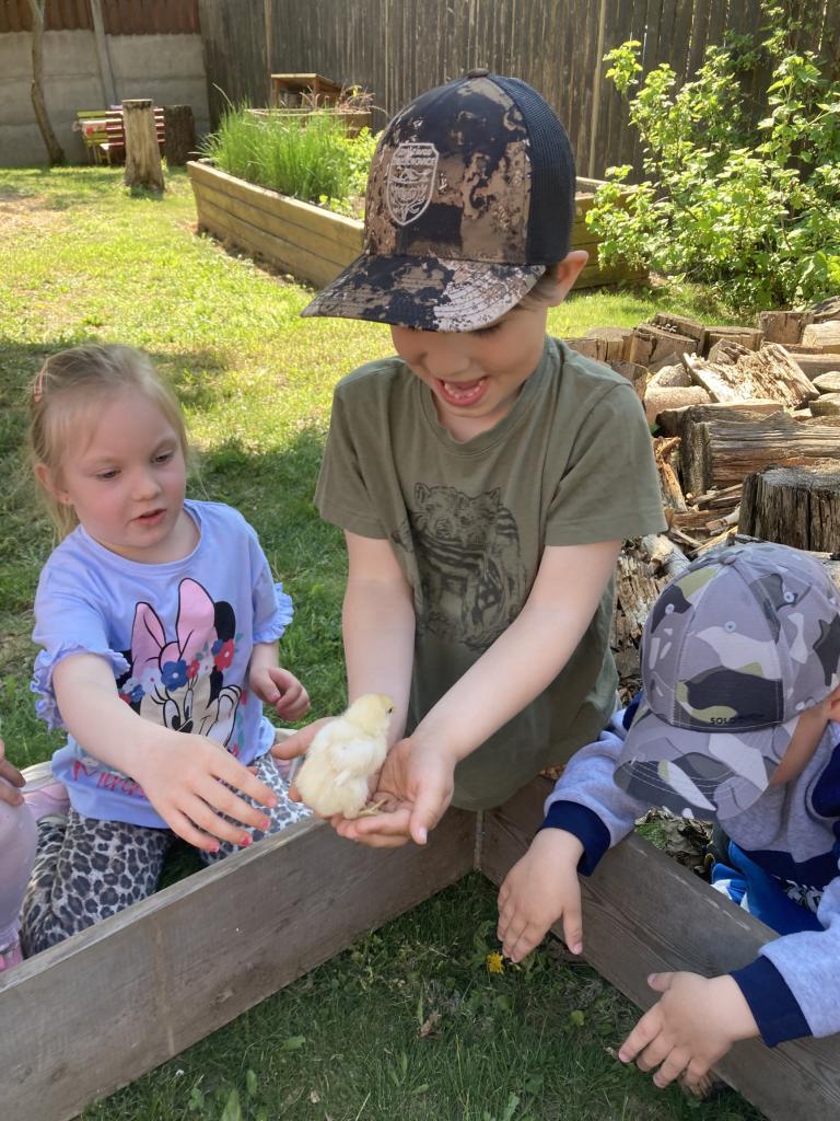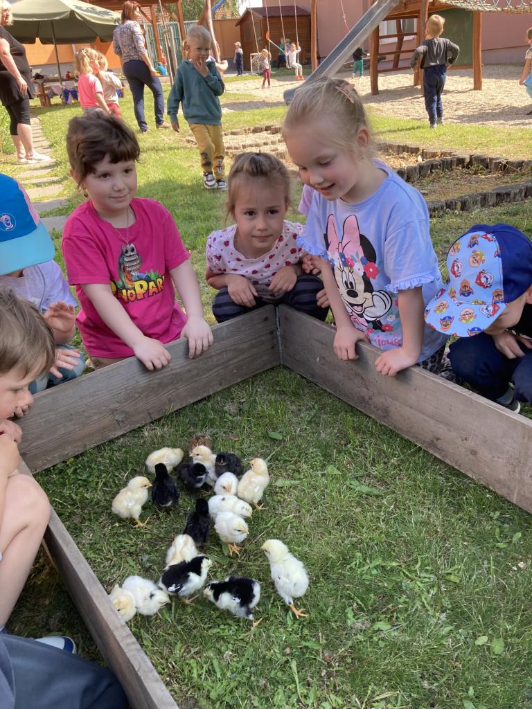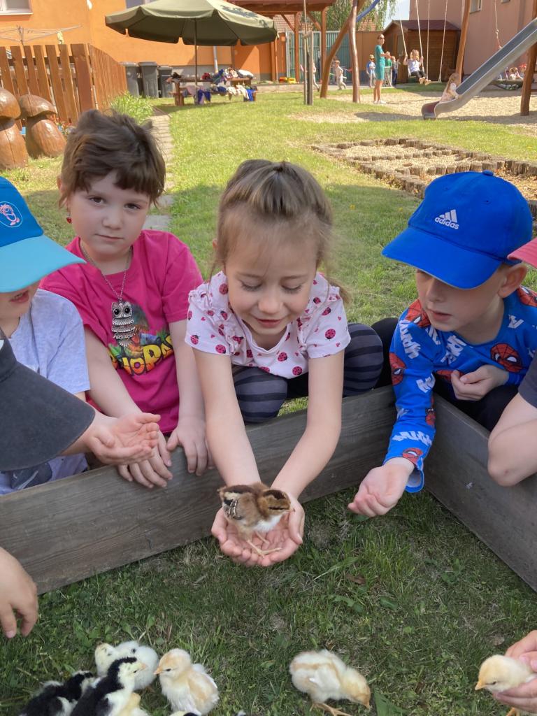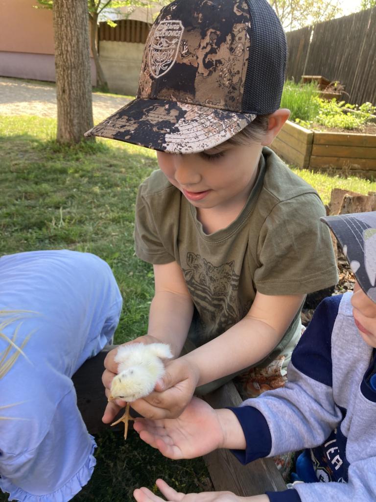 V úterý nás v krásný teplý den navštívil dědeček od Miriamky H.a Viktorka V. a dovezl nám ukázat kuřátka.
