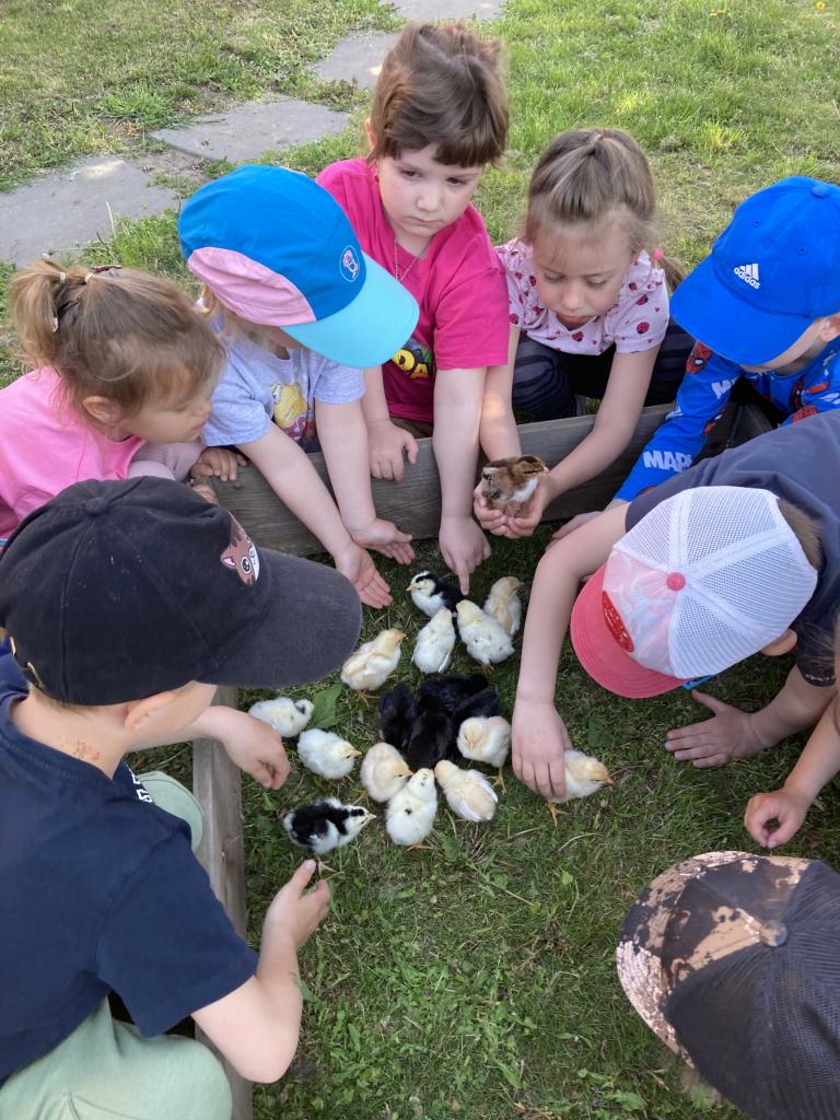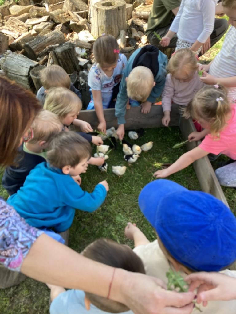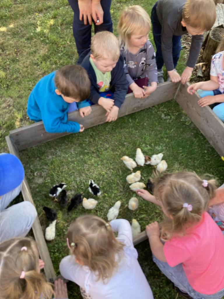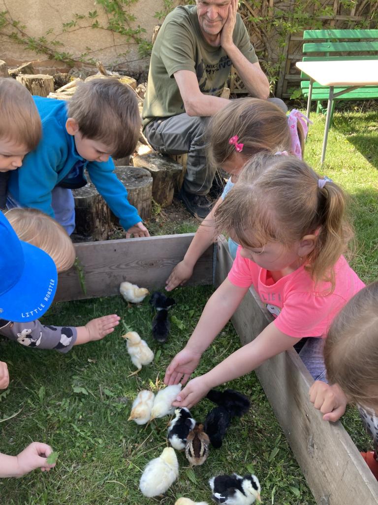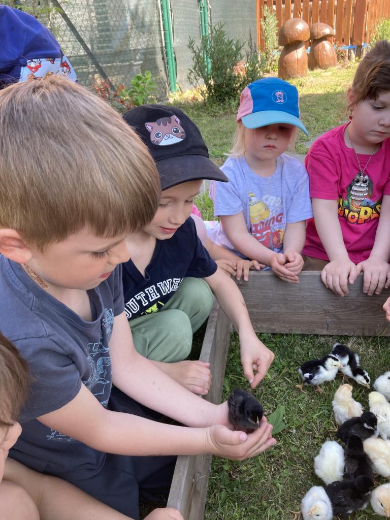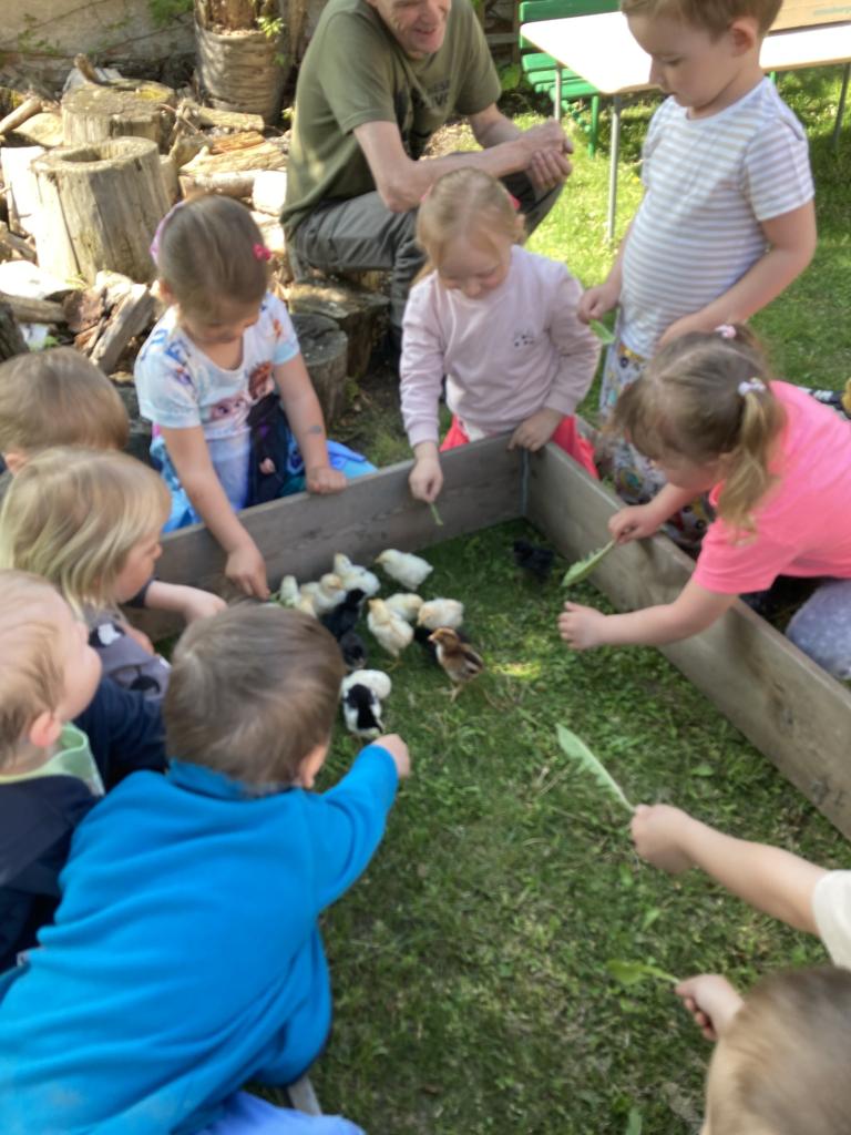 V úterý nás v krásný teplý den navštívil dědeček od Miriamky H.a Viktorka V. a dovezl nám ukázat kuřátka.