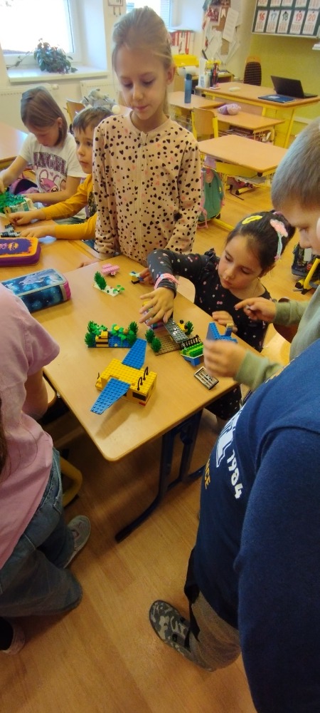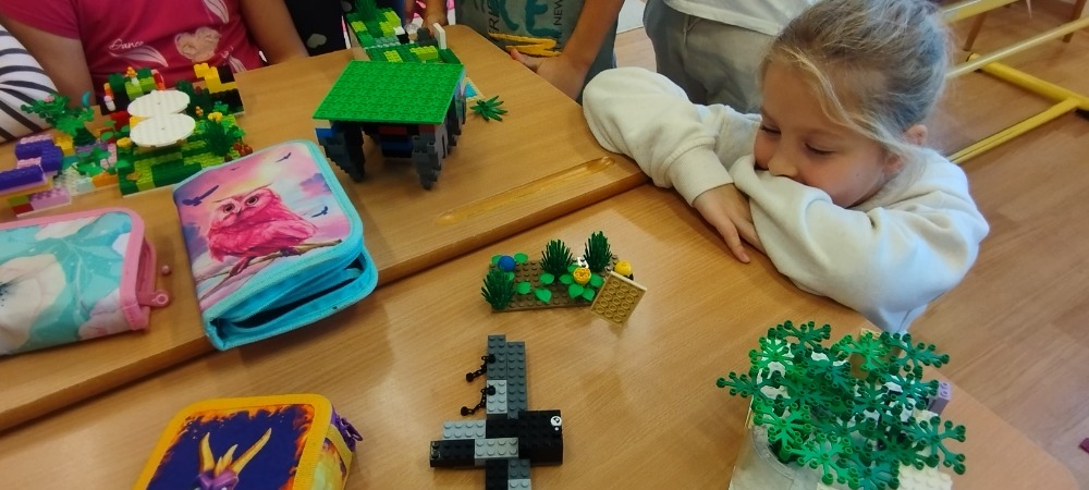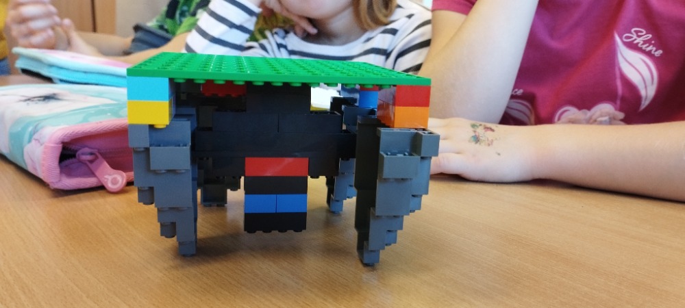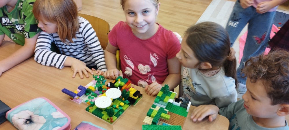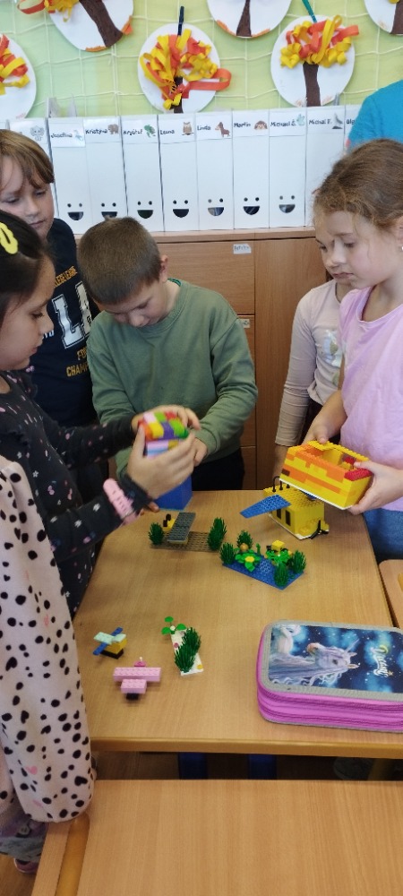 V druhé části se pustily do stavění z LEGO® kostek – každá skupinka nejprve postavila vlastního opylovače a pak navrhla vlastní model řešení pro jejich lepší život: barevné louky, úkryty pro včelky nebo města přátelská přírodě.
